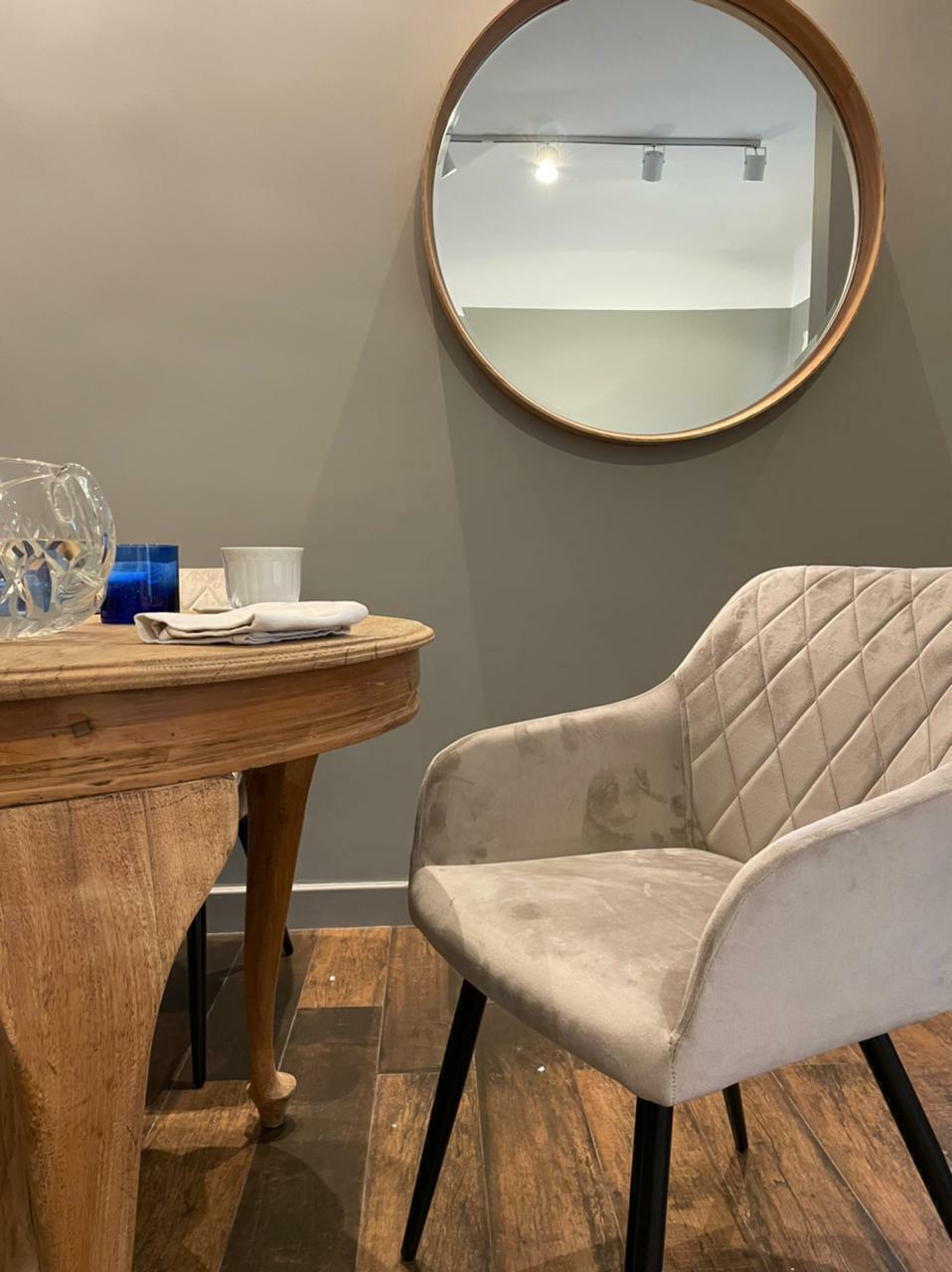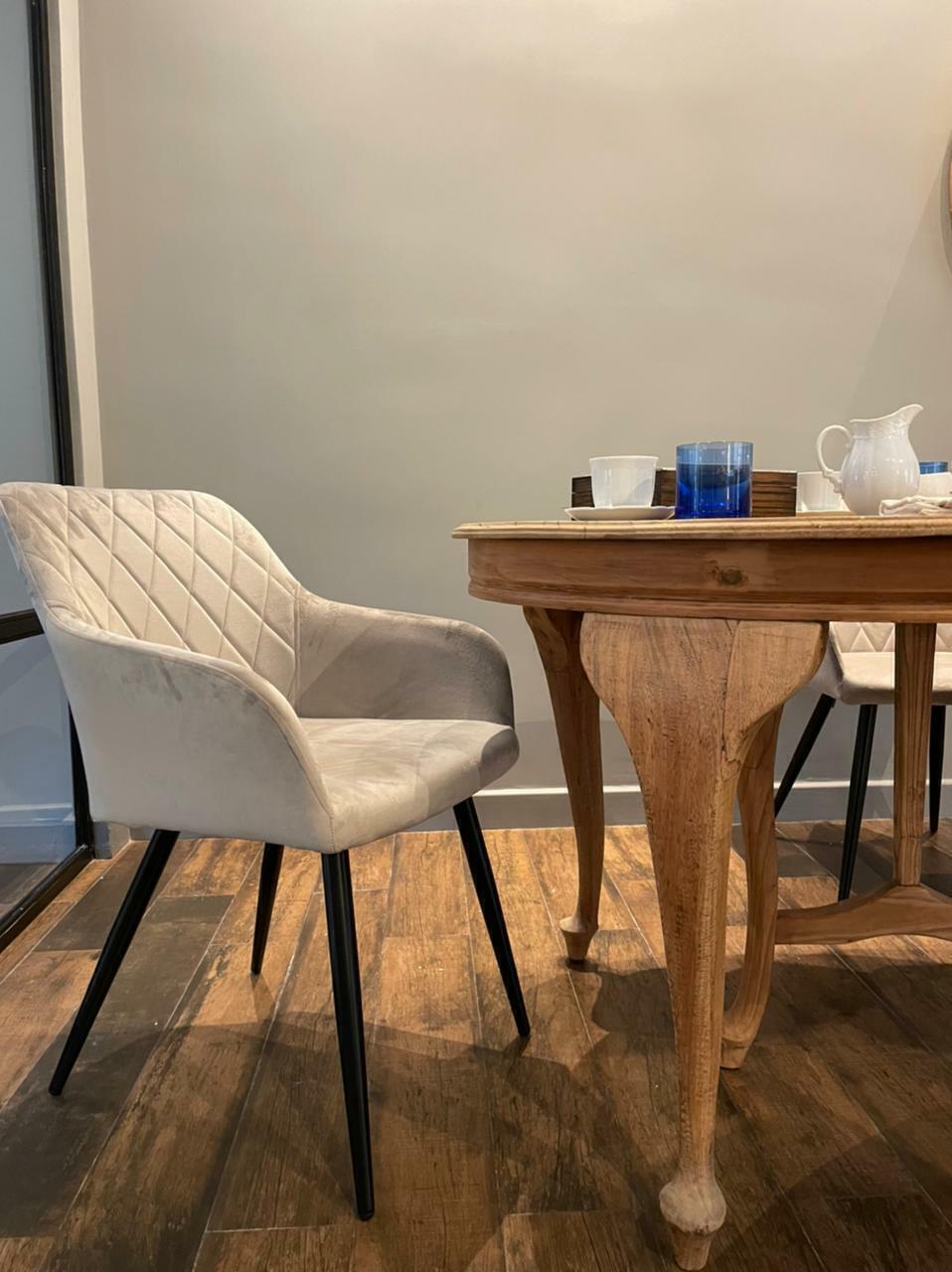 Tapizado a rombos en género terciopelo, con patas negras de metal en terminación mate.